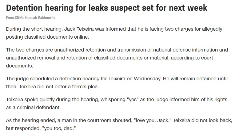 У суді Бостона підозрюваний у зливі документів Пентагону Джек Тейшейра в кайданах і тюремній формі став перед федеральним суддею Девідом Хеннессі, який зачитав йому звинувачення.