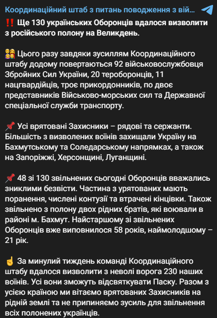 Подробиці Великоднього обміну повідомляє у телегрім-каналі Координаційний штаб з обміну військовополоненими.