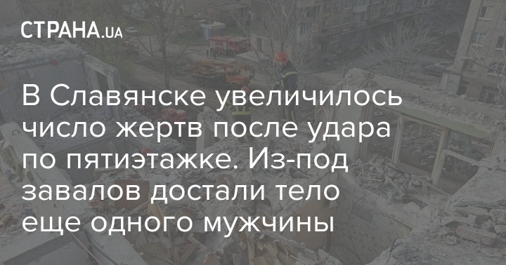 Число жертв п'ятничного обстрілу Слов'янська на Донеччині збільшилося до 12, з-під завалів дістали тіло ще одного чоловіка. Пошуково-рятувальні роботи продовжуються.
