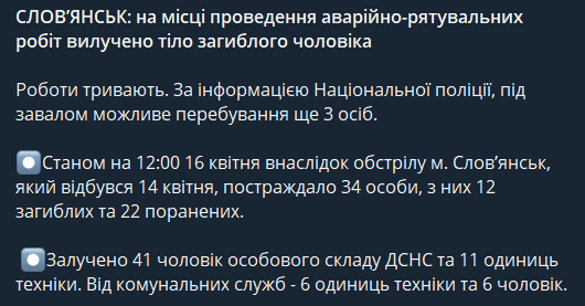 "Станом на 12:00 16 квітня внаслідок обстрілу м. Слов'янськ, який відбувся 14 квітня, постраждали 34 особи, з них 12 загиблих та 22 поранені", - заявляє ДСНС.