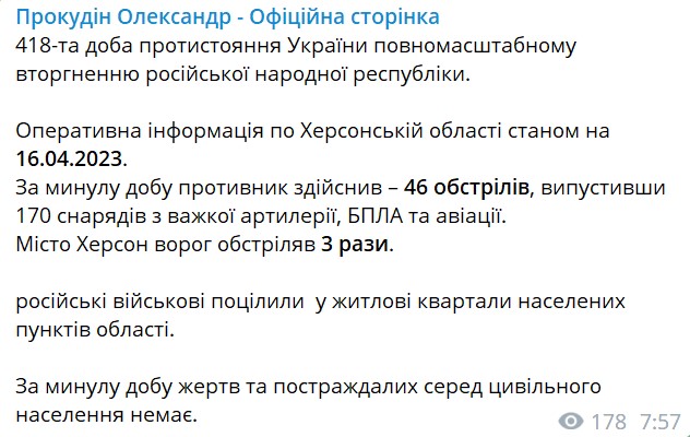 Минулої доби російська армія 46 разів обстріляла Херсонську область, випустивши 170 снарядів з важкої артилерії, безпілотників та авіації. Обласний центр ворог обстріляв тричі.
