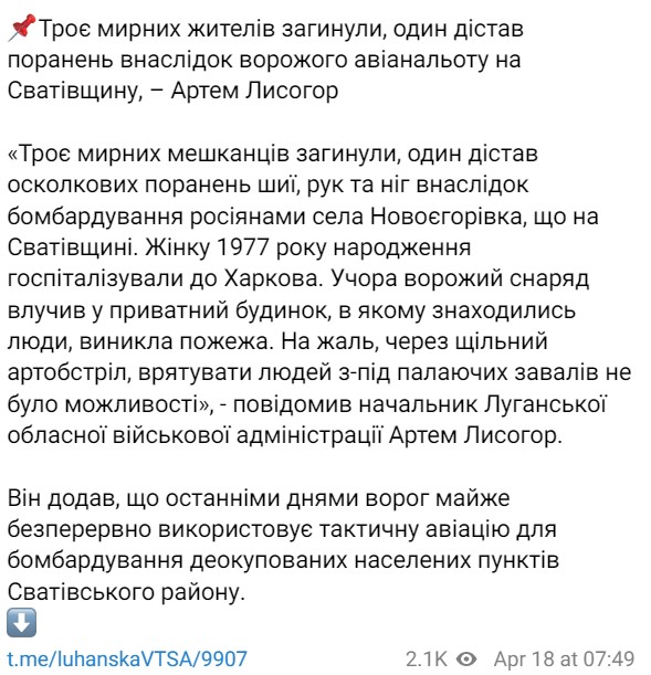 У селі Новоєгорівка Луганської області в результаті російського авіаудару в приватному будинку загинули троє мирних жителів, ще одну жінку поранено.