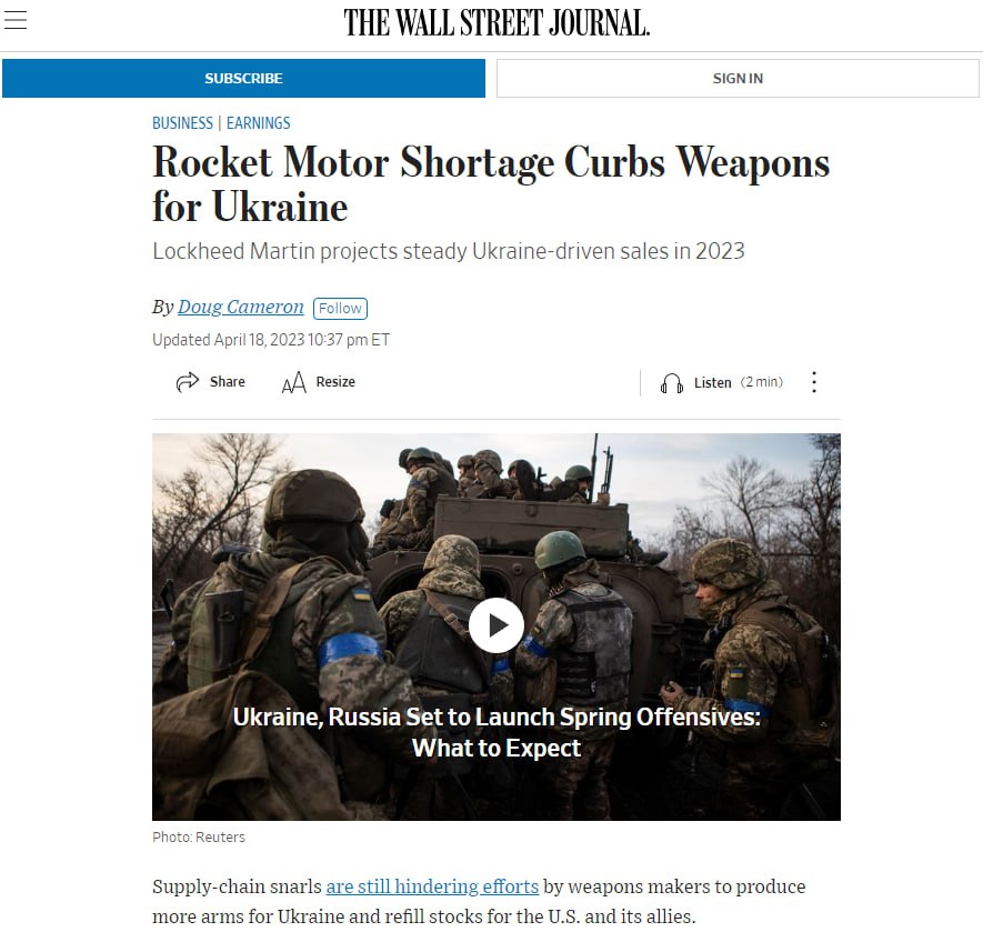 Компанія Lockheed Martin Corp. 18 квітня заявила, що дефіцит ключових компонентів, таких як ракетні двигуни для GMLRS та інших ракет, продовжує перешкоджати зусиллям щодо нарощування виробництва.