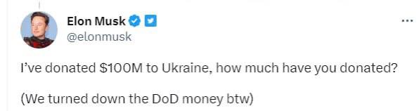 Маск відповів так: "Я пожертвував Україні 100 мільйонів доларів, скільки ви пожертвували? До речі, ми відмовилися від грошей Міністерства оборони". Ймовірно, маючи на увазі, що він зняв вимогу оплатити роботу системи Старлінк для потреб української армії.