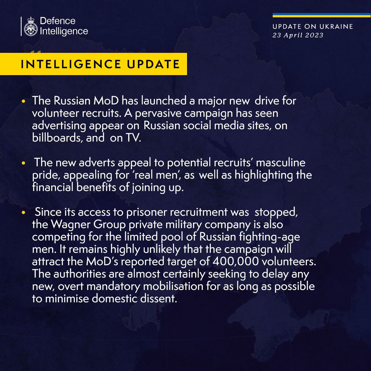 10:40 Міноборони Росії запустило нову масштабну кампанію з набору добровольців, констатує британська військова розвідка у сьогоднішньому зведенні.