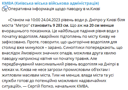 Це найбільше падіння рівня води з початку повені. Аварійні підтоплення по місту Києву не зафіксовані, проте синоптики попереджають про можливість другої хвилі паводку наприкінці квітня або на початку травня внаслідок значних опадів.