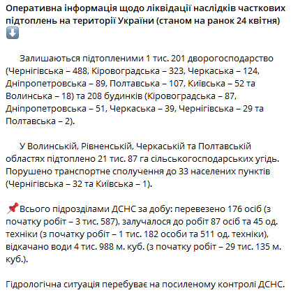 Україна бореться з наслідками часткових підтоплень через весняну повінь. Рятувальники оприлюднили оперативну інформацію на 24 квітня.