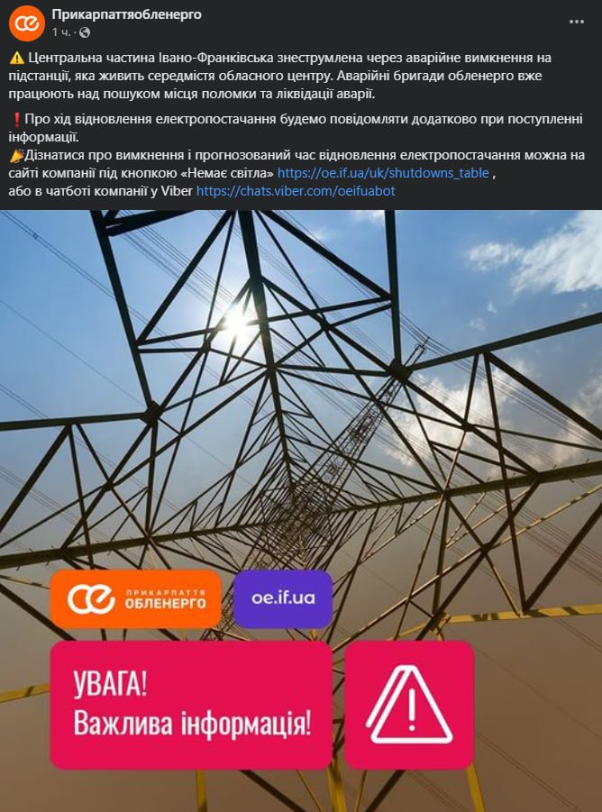 11.48 Центр Івано-Франківська знеструмлено через аварійне відключення підстанції, повідомляє Прикарпаттяобленерго.