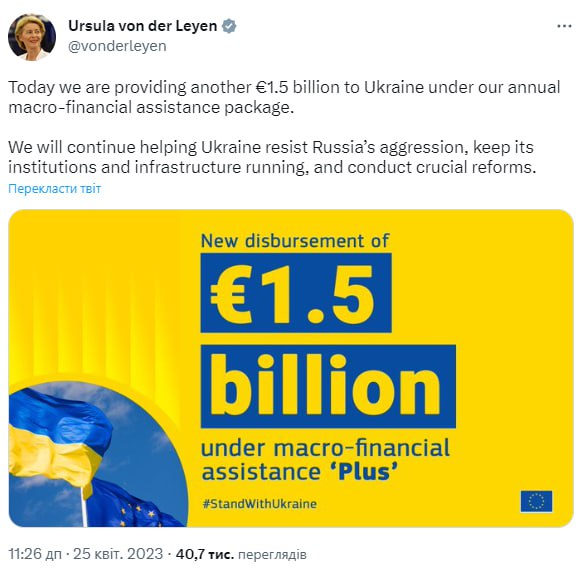 "Сьогодні ми надаємо Україні ще 1,5 млрд євро в рамках нашого щорічного пакету макрофінансової допомоги. Ми продовжуватимемо допомагати Україні протистояти агресії Росії, підтримувати роботу її інститутів та інфраструктури та проводити важливі реформи", - заявила глава Єврокомісії Урсула фон дер Ляйєн.