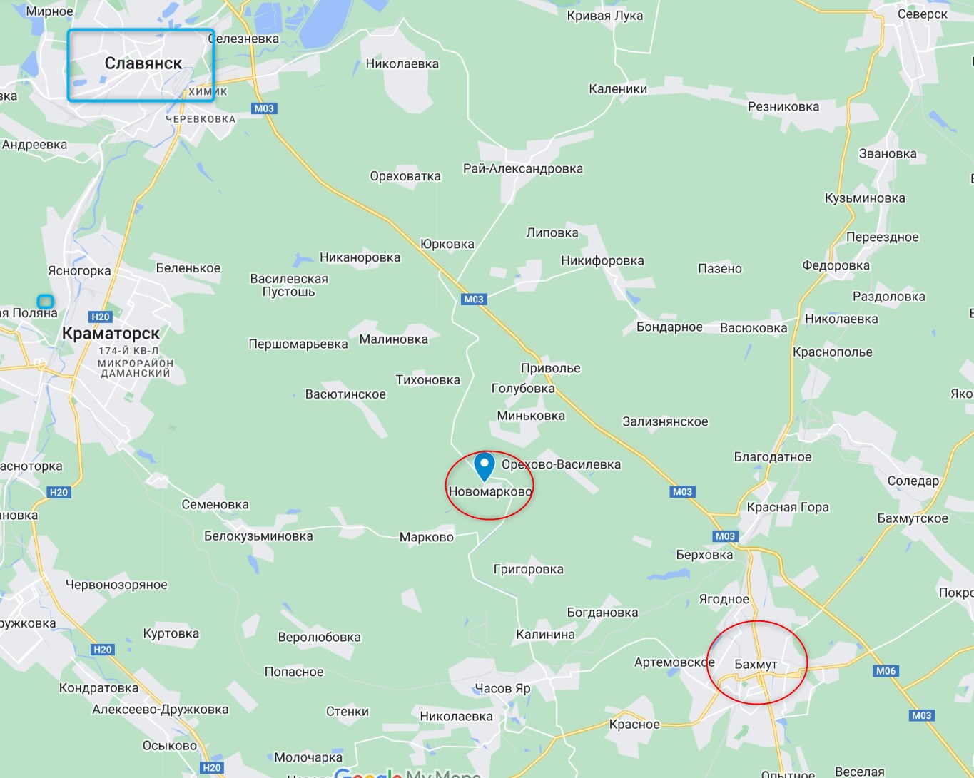 Новомаркове знаходиться на дорозі, що веде зі Слов'янська до Часового Яру через трасу М-03 і з'явилося у зведеннях від учорашнього дня.