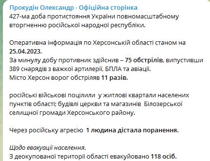 Щодо евакуації населення, то з деокупованої території області було евакуйовано 118 осіб.