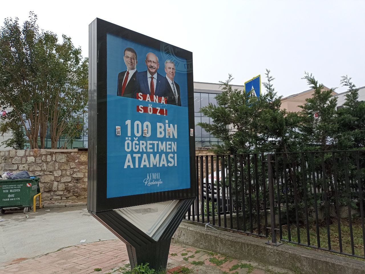 Агітація противника Ердогана виглядає скромнішою. Киличдароглу на плакатах у товаристві популярних мерів Стамбула Імамоглу та Анкари Явашем обіцяє призначити 100 тисяч вчителів до шкіл, на іншому банері обіцяє дівчині у хіджабі індустріальні перетворення за допомогою 300 млрд доларів інвестицій.