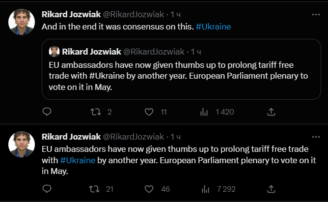 "Посли ЄС схвалили продовження безмитної торгівлі з Україною ще на рік. Пленарне засідання Європарламенту проголосує щодо нього у травні. І в результаті було досягнуто консенсусу з цього приводу", - повідомив Йозвяк.