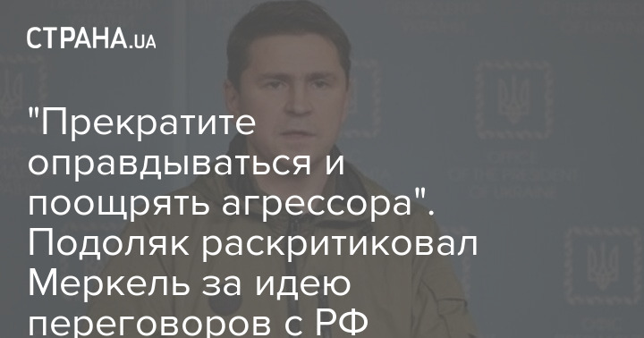 На Банковій розкритикували екс-канцлера Німеччини Ангелу Меркель за її думку про можливість мирних переговорів із Росією. Так, радник глави Офісу президента Михайло Подоляк звинуватив її у зневаженні свободи України, заявивши про те, що виправдовувати агресора не можна.