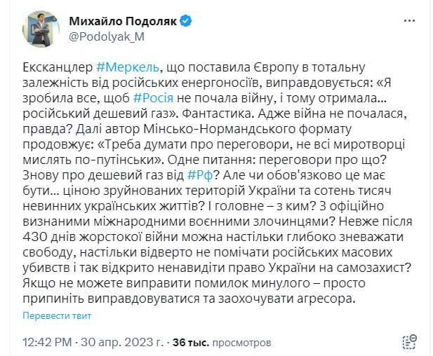 "Одне питання: переговори про що? Знову про дешевий газ від РФ? Але чи обов'язково це має бути... ціною зруйнованих територій України та сотень тисяч невинних українських життів? І головне – з ким? З офіційно визнаними міжнародними військовими злочинцями? Невже після 430 днів жорстокої війни можна настільки глибоко нехтувати свободою, настільки відверто не помічати російських масових вбивств і так відкрито ненавидіти право України на самозахист? Якщо ви не можете виправити помилки минулого – просто припиніть виправдовуватися та заохочувати агресора", - заявив радник голови ОП Михайло Подоляк.