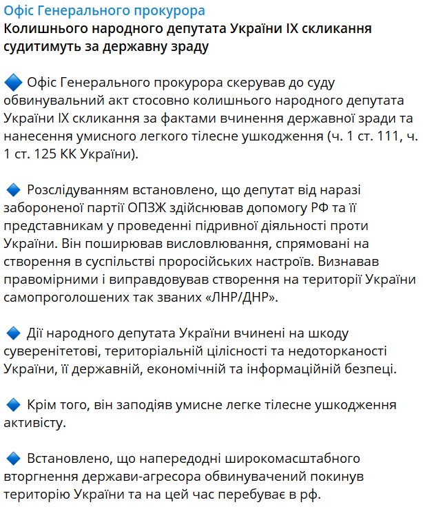 "Депутат від забороненої партії ОПЗЖ здійснював допомогу РФ та її представникам у проведенні підривної діяльності проти України. Він розповсюджував висловлювання, спрямовані на створення у суспільстві проросійських настроїв", - повідомляють в Офісі генерального прокурора.