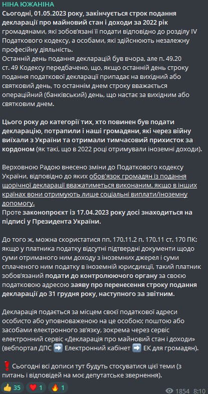 За її словами, законопроект, який скасовує для біженців подання декларацій, досі не підписаний президентом Володимиром Зеленським, а отже, не набрав чинності.