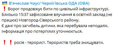 У Чернігівській області внаслідок обстрілу непрацюючої освітньої установи в Новгород-Сіверському районі загинула дитина, яка знаходилася неподалік.