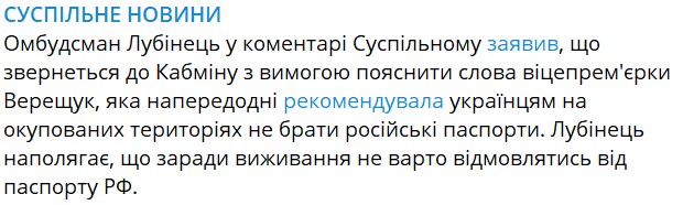 Вперше Лубинець зробив таку заяву у п'ятницю. За його словами, готується законопроект щодо відмови від паспорта РФ для тих, хто захоче це зробити.