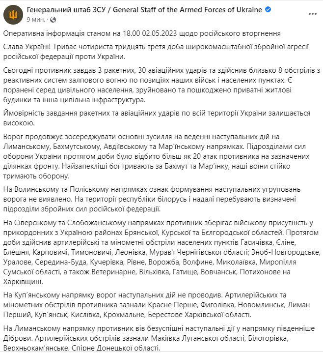 Війна в Україні триває вже 433-й день. Ми слідкуємо за новинами 2 травня у своєму онлайні.