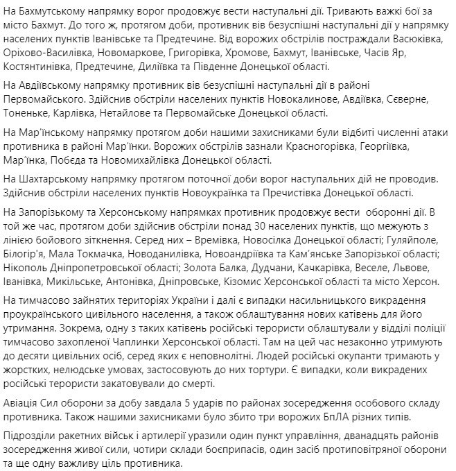 Минулої доби епіцентр бойових дій, як і раніше, знаходиться Бахмут і Мар'їнка. Відбито 20 атак противника на зазначених ділянках фронту, збито 3 ворожі БПЛА і завдано 5 ударів по місцях зосередження особового складу противника.