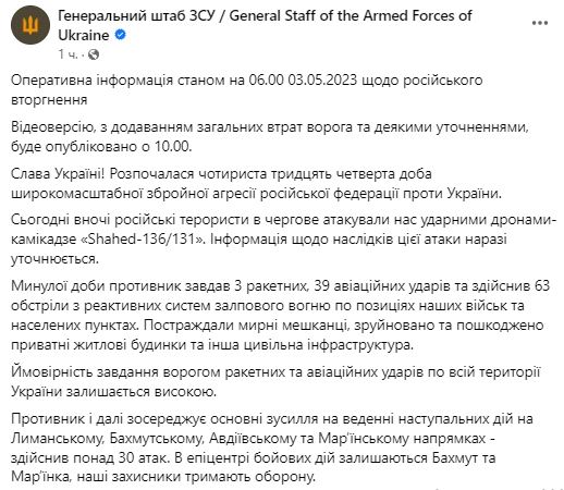 В середу, 3 травня, Генштаб ЗСУ оприлюднив зведення про ситуацію за минулу добу.