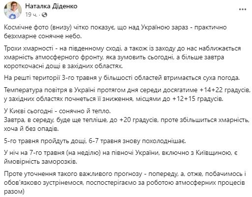 Синоптик Наталія Діденко пише, що сьогодні можливі короткочасні дощі у західних областях. На решті території 3 травня у більшості областей утримається суха погода.