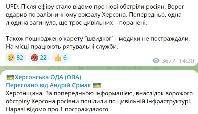 Російська армія вдарила по залізничному вокзалу Херсона. За попередніми даними, одна людина вбита, троє поранено.
