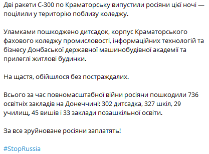 За даними Кириленка, всього за час повномасштабної війни росіяни пошкодили 736 освітніх закладів у Донецькій області: 302 дитсадки, 327 шкіл, 29 училищ, 45 вишів та 33 заклади позашкільної освіти.