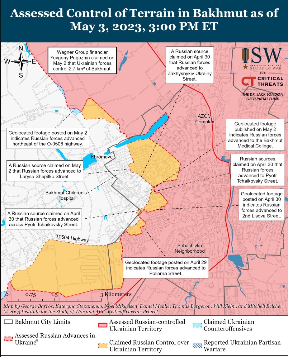 Як повідомляє "Інститут вивчення війни", росіяни просунулися ближче до шосе на північний захід від Хромова та захопили Бахмутський медичний коледж.