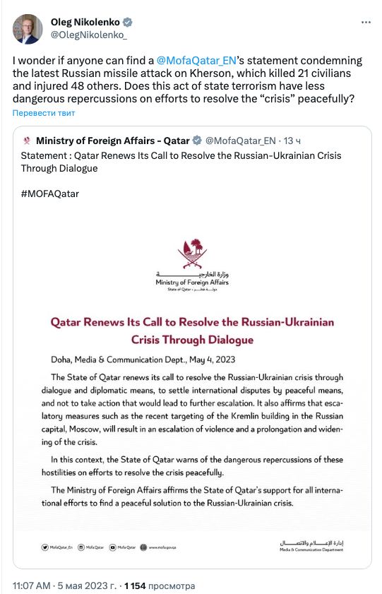 «Цікаво, чи може хтось знайти заяву МЗС Катару, яка засуджує останній російський ракетний удар по Херсону, внаслідок якої загинув 21 мирний житель і 48 отримали поранення. Чи має цей акт державного тероризму менш небезпечні наслідки для зусиль щодо врегулювання «кризи» мирним шляхом?», - написав Ніколенко у відповідь.