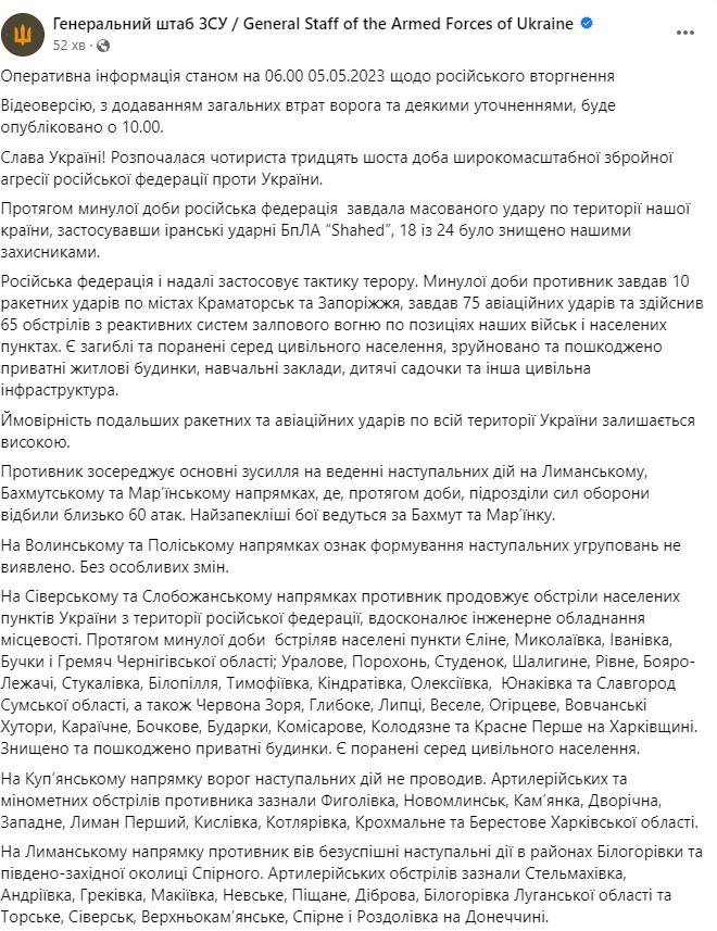 Докладніше про те, що відбувалося вчора – читайте у підсумках за 4 травня.