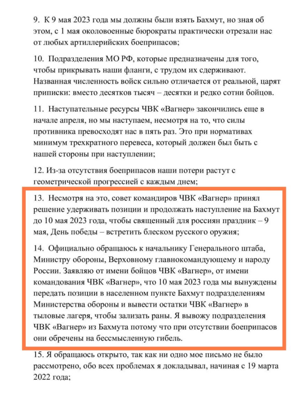 11:30 Щодо заяви Пригожина про те, що він йде з позицій під Бахмутом з 10 травня через те, що міноборони РФ йому не дає снаряди.