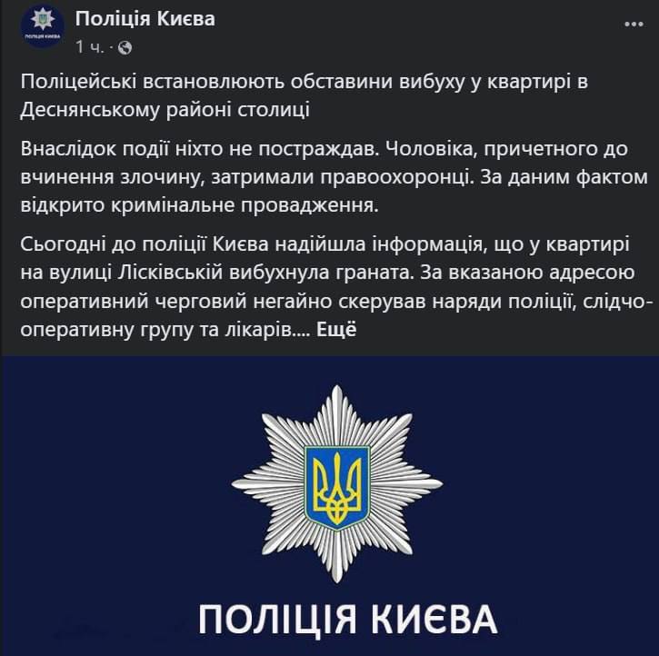 У Києві у квартирі на вулиці Лисковській у Деснянському районі вибухнула граната. Ніхто не постраждав.