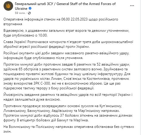 В понеділок, 22 травня, Генштаб ЗСУ оприлюднив зведення про ситуацію на фронті.