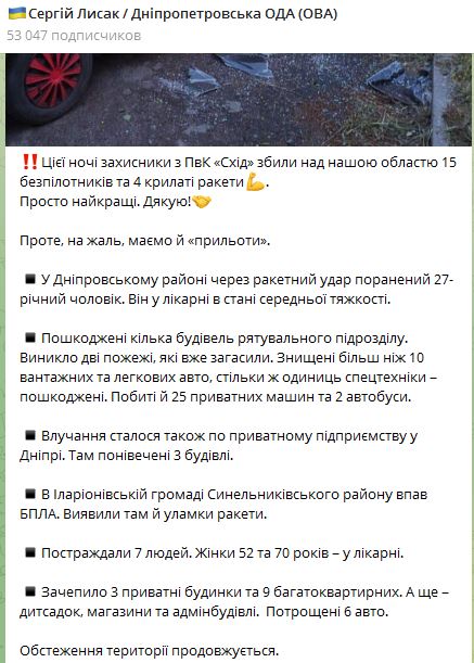 - Над областю було збито 15 безпілотників та 4 крилатих ракети. Однак, були і "прильоти".
