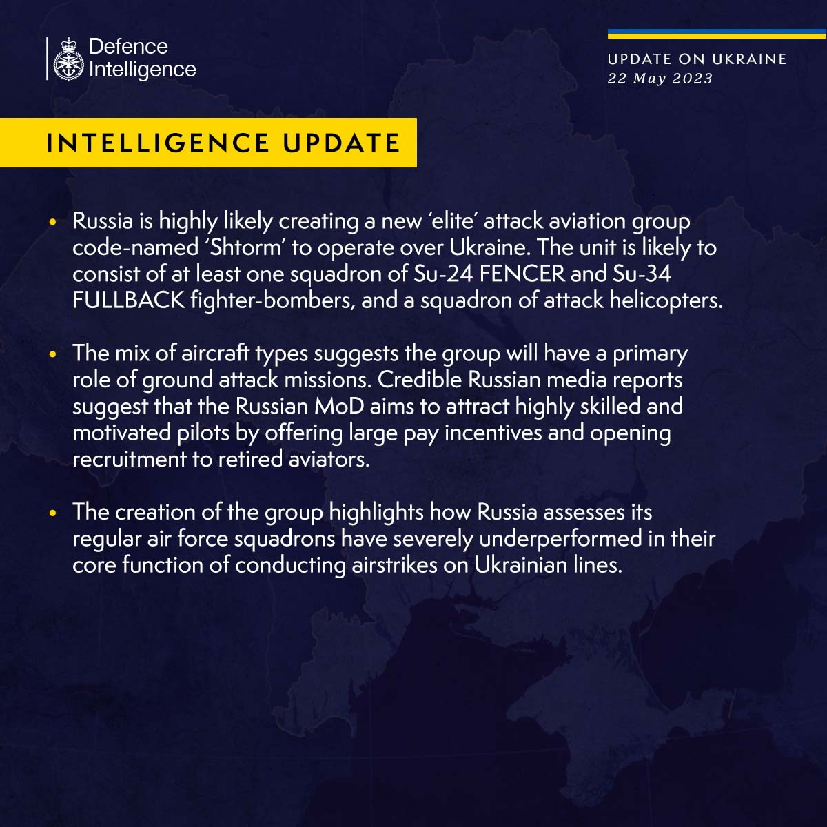 Росія створює нову авіаційну групу для ударів по Україні, до складу якої, ймовірно, увійде щонайменше одна ескадрилья винищувачів-бомбардувальників Су-24 та Су-34, а також ескадрилья бойових вертольотів. Її кодова назва – "Шторм".