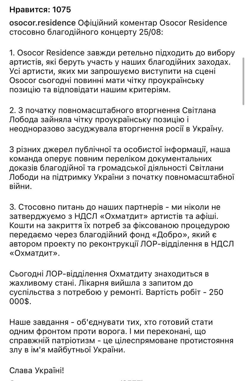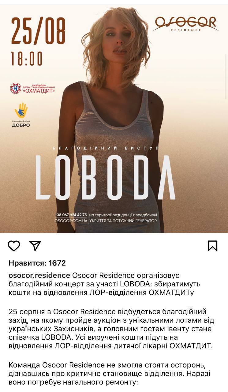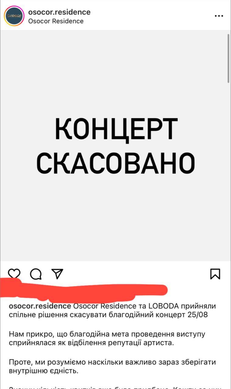 "Osocor Residence та LOBODA прийняли спільне рішення скасувати благодійний концерт 25/08. Нам прикро, що благодійна мета проведення виступу сприйнялася як відбілювання репутації артиста. Проте ми розуміємо, наскільки важливо зараз зберігати внутрішню єдність. Значну кількість квитків уже було придбано. Кошти за них буде повернуто", - повідомили в "Osocor Residence".