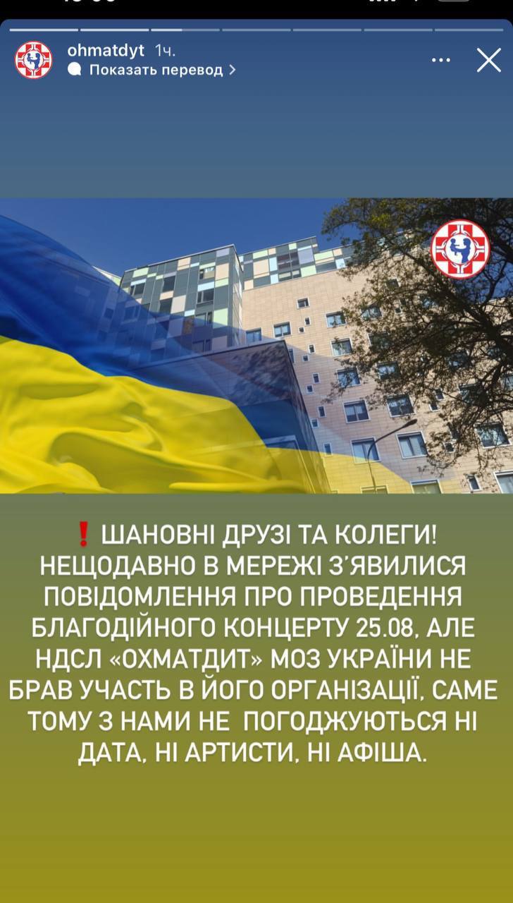 "Шановні друзі та колеги! Нещодавно у мережі з'явилася інформація про проведення благодійного концерту 25.08, але ПДВ "ОХМАТДИТ" МОЗ України не брав участі в його організації, саме тому з нами не погоджують ні дат, ні артистів, ні афіш", - написали в "ОХМАТДИТ".