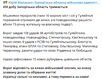 Загальна кількість атак склала 108, серед яких було 96 артобстрілів по містах та селах, таким як Гуляйполе, Новоданилівка, Новоандріївка, Степногірськ, Кам'янське та іншим. Додатково противник здійснив 6 ударів з ракетно-артилерійських систем по Гуляйпільському, Білогір'ю, Темировке, а також здійснив атаки БПЛА на Степове, Ольгівське, Малинівку, Червоне, завдав ракетних ударів - по селах Різдвянка та Любицьке.