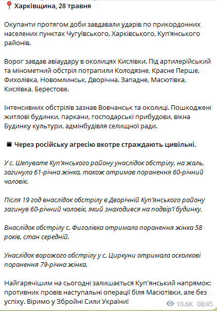Росія атакувала прикордонні населені пункти Чугуївського, Харківського, Куп'янського районів. Під артилерійський та мінометний обстріл потрапили Колодязне, Червоне Перше, Фіголовка, Новомлинськ, Дворічна, Західна, Масютівка, Кислівка, Берестове.