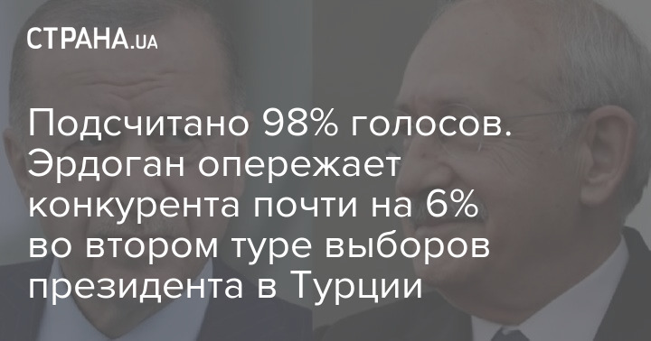За даними видання Yeni Şafak, після підрахунку 98% голосів на виборах президента Туреччини Ердоган набирає 52,8%, а Киличдароглу – 47,2%.
