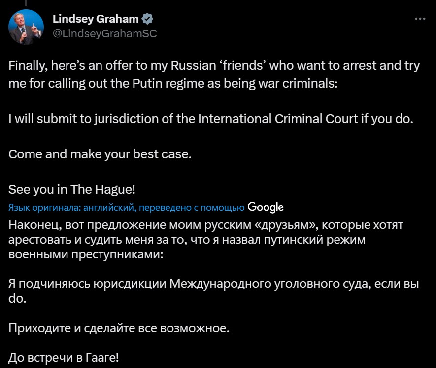 У Росії продовжили критикувати Грема, відштовхуючись від його заяви про те, що українці залишилися вільними, а росіяни помирають в Україні. А сам сенатор у Твіттері написав, що якщо росіяни хочуть його заарештувати, то нехай приїжджають до Гааги.