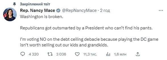 "Я голосую "проти" збільшення стелі боргу, тому що гра не варта того, щоб продавати наших дітей та онуків", - повідомила Ненсі Мейс.