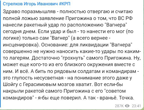 А бити по рядових солдатах і командирах – це дурниця несусвітня – на розуміння цього навіть у Шойгу з Герасимовим мізків вистачить. Ось якби накрили ракетою самого Пригожина з його "порадою командирів" - я б ще повірив. А так – брехня”, – написав Гіркін.