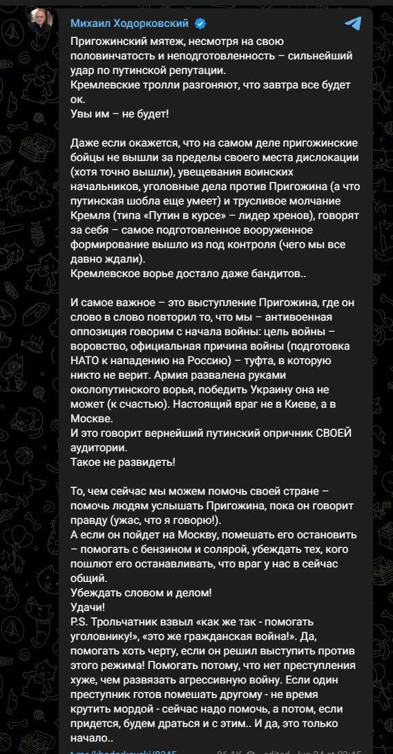 2. Наразі очевидно, що жодної підтримки у російській владі та в оточенні Путіна Пригожин не користується. Він діє на свій страх і ризик, відчувши, мабуть, себе «великим вождем», а, можливо, й увійшовши в контакт із Заходом та Україною з метою усунення від влади Путіна. Ця версія немає доказів. Але в неї цілком укладаються дії Пригожина та його публічна «зрадлива» риторика останніх двох місяців.