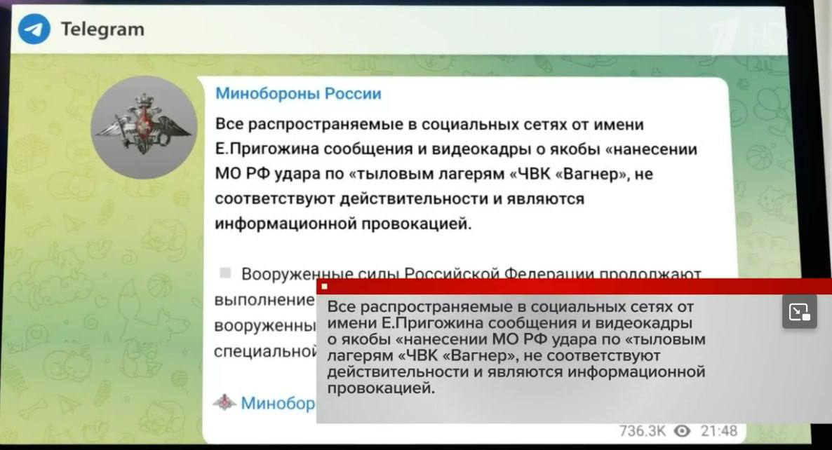 У російському міноборони заявили, що "всі поширені в соціальних мережах від імені Є.Пригожина повідомлення та відеокадри про нібито завдання МО РФ удару по тилових таборах ПВК "Вагнер" не відповідають дійсності і є інформаційною провокацією".