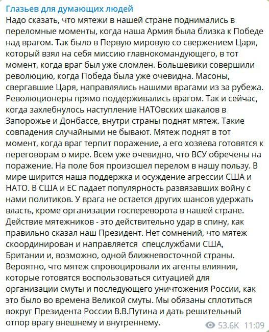 Про це пише, наприклад, екс-радник Путіна Сергій Глазьєв, який заявляє, що Пригожин підняв заколот у той момент, коли настання ВСУ не дало результату, а Захід «готується до переговорів про мир».
