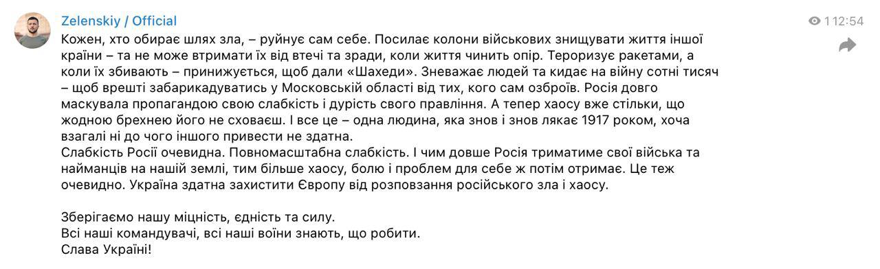 «Кожен, хто обирає шлях зла, руйнує сам себе. Принижує людей і кидає на війну сотні тисяч – щоб нарешті забарикадуватись у Московській області від тих, кого сам озброїв. Росія довго маскувала пропагандою своєї слабкості та дурості свого правління. А тепер хаосу вже стільки, що жодною брехнею його не приховаєш. Слабкість Росії очевидна. Повномасштабна слабкість. І чим довше Росія триматиме свої війська та найманців на нашій землі, тим більше хаосу, болю та проблем для себе потім отримає».