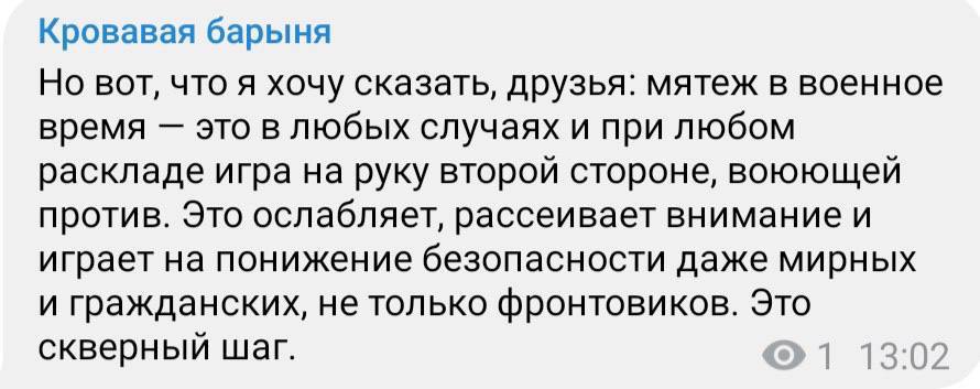 Але, незважаючи на всі ці гранично очевидні ознаки загрози заколоту і смути, що виходить від Пригожина, жодних превентивних заходів щодо нього російська влада не вживала (хоча багатьох людей в РФ відправляють до в'язниць і за куди менш радісні заяви). Більше того, продовжувався невгамовний піар «вагнерівців», зокрема й на підконтрольних Кремлю телеграм-каналах.